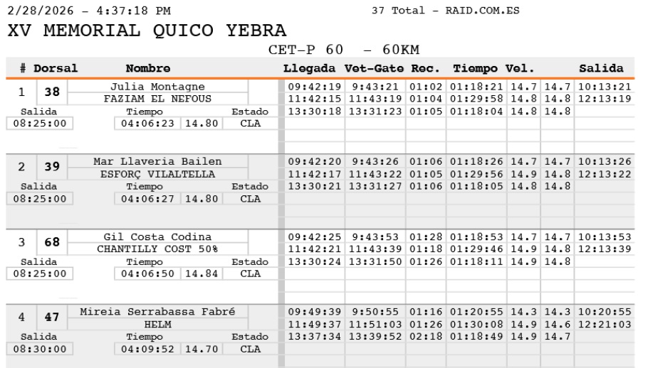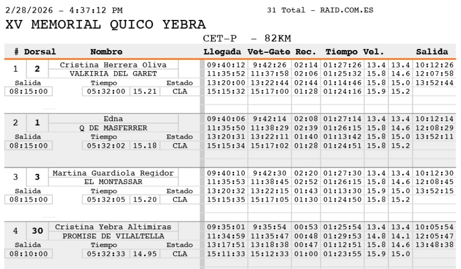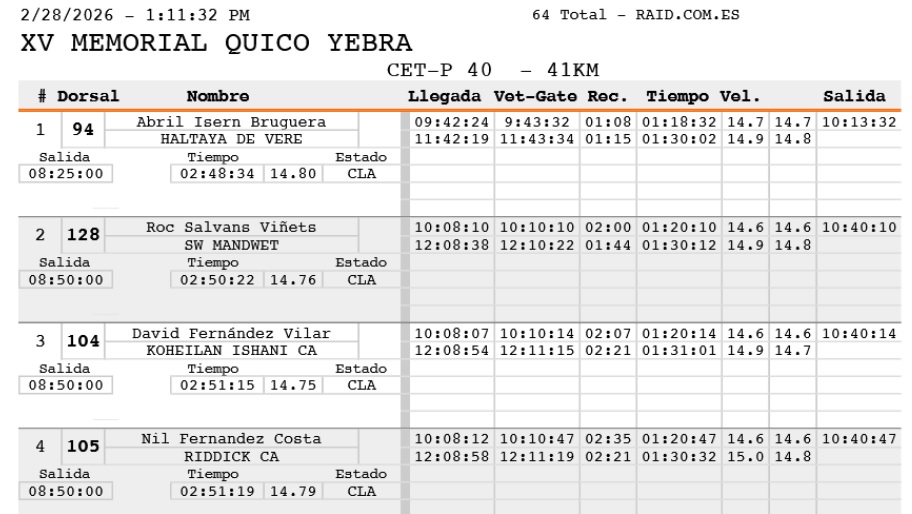 Fuente:DarwinData. Federació Catalana d’Hípica. Resultats provisionals Raid