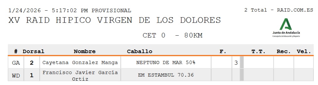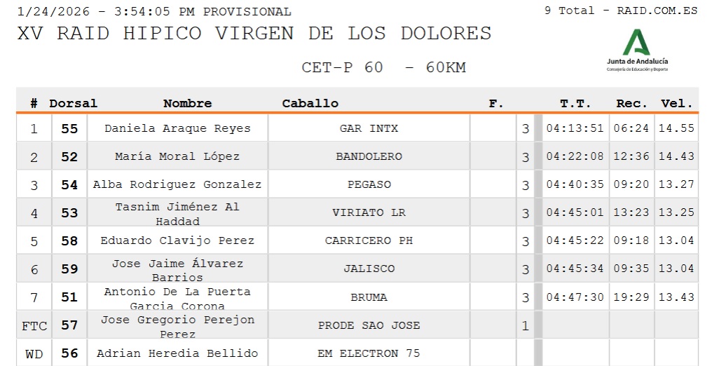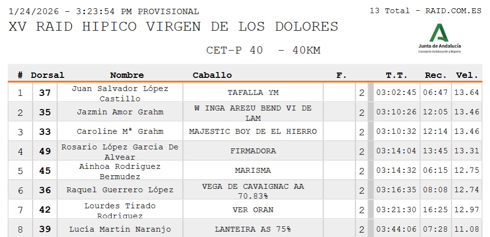 Estos son los Resultados Provisionales del XV Raid Hípico Virgen de los Dolores en Osuna (Sevilla). Prueba organizada por  la Hermandad de Nuestra Madre y Señora de los Dolores. Que se ha corrido hoy día 24 de Enero de 2026.