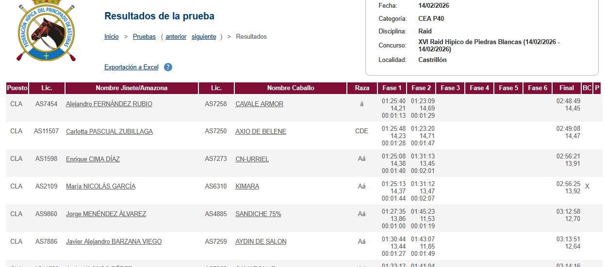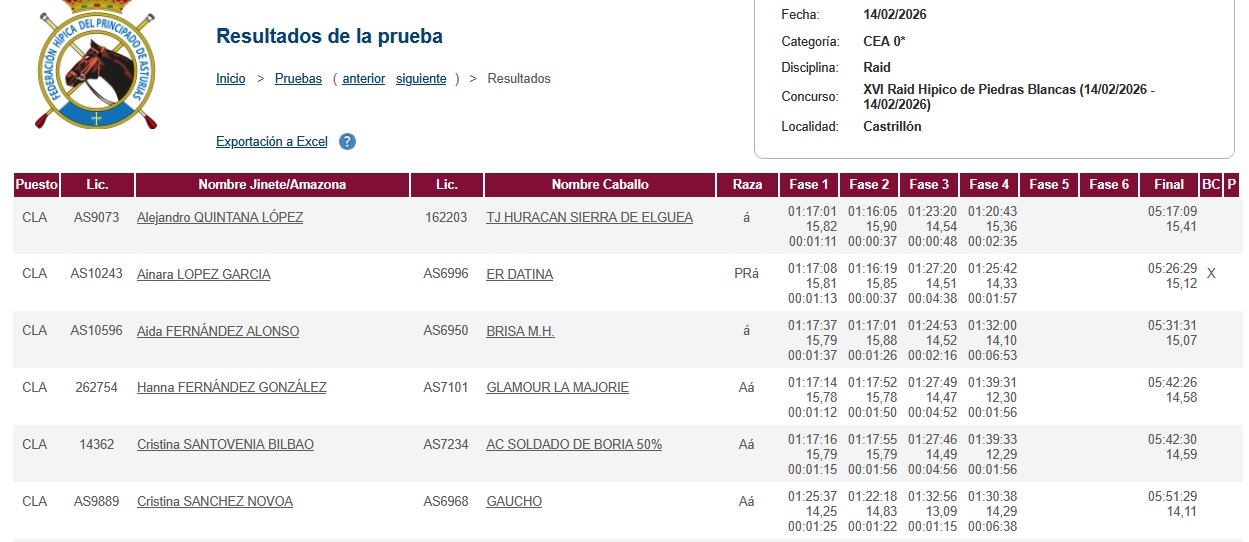 Estos son los Resultados del XVII Raid Hipico de Piedras Blancas en Castrillón (Asturias), prueba organizada por CB VALCARJO. Que se corrió ayer día 14 de Febrero de 2026.