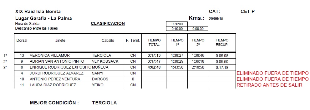 Resultados Oficiales del XIX Raid Hípico Isla Bonita en la Palma (Stª Cruz de Tenerife), prueba que se han celebrado en el día de hoy 20 de Junio de 2015.