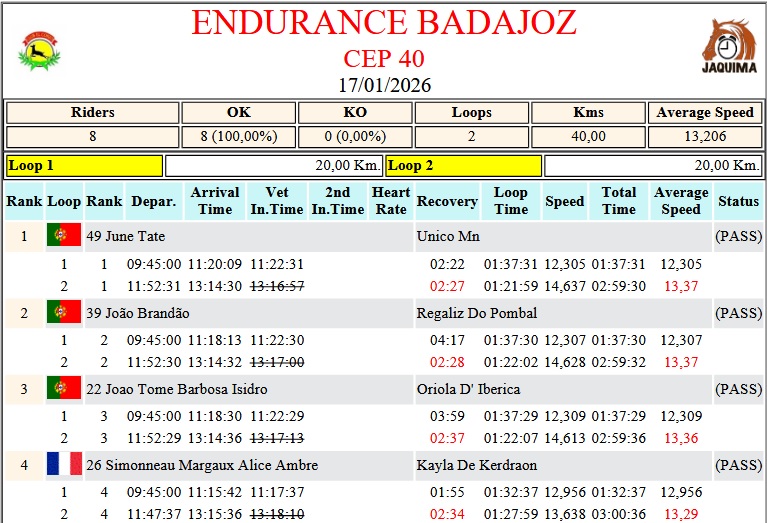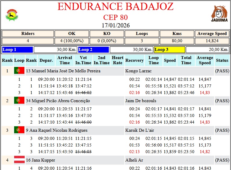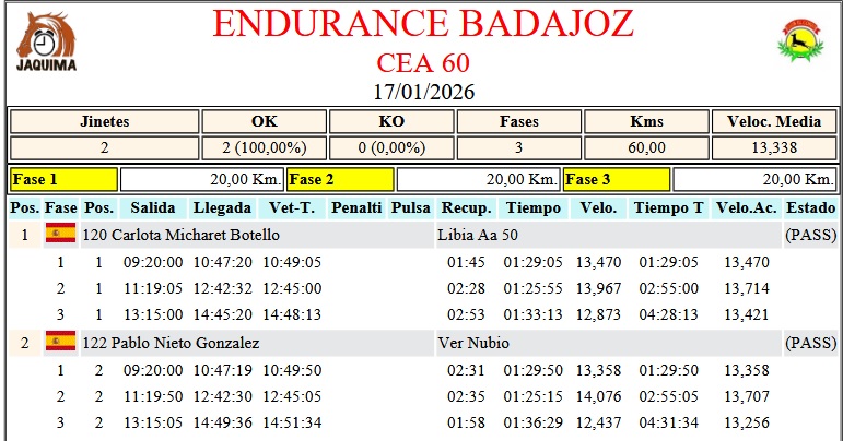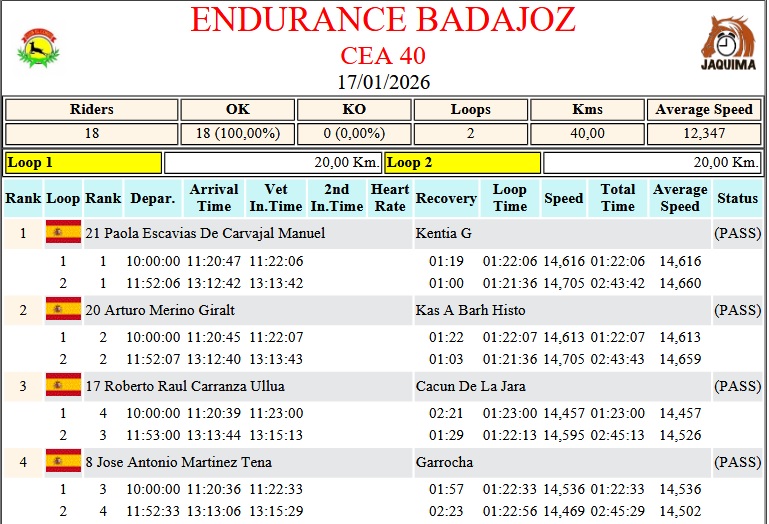 Estos son los Resultados Provisionales del Raid Hípico de Badajoz, prueba organizada por el Club Hípico El Corzo. Que se ha corrido en el día de hoy día 17 de Enero de 2026.