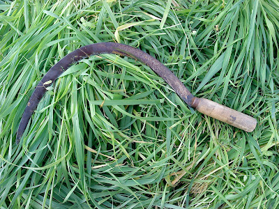 - El trabajo de la siega tiene sus complicaciones, ya lo expliqué en un articulo anterior, si se siega con la hoz tradicional, al coger el manojo de verde, hay que pasar la mano por encima de la hoz antes de dar el corte, ya que la hoz tiene un filo que si contacta con cualquiera de los dedos, los puede dejar muy dañados.
