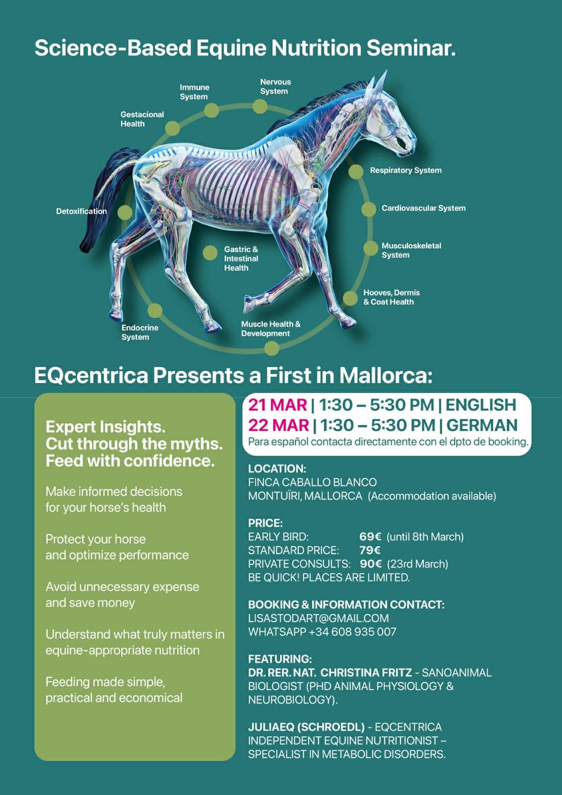 Julia EQ de EQcentrica, me remite información sobre un Seminario sobre Nutrición Equina, a desarrollar en Palma de Mallorca los días 21 y 22 de Marzo de 2026.