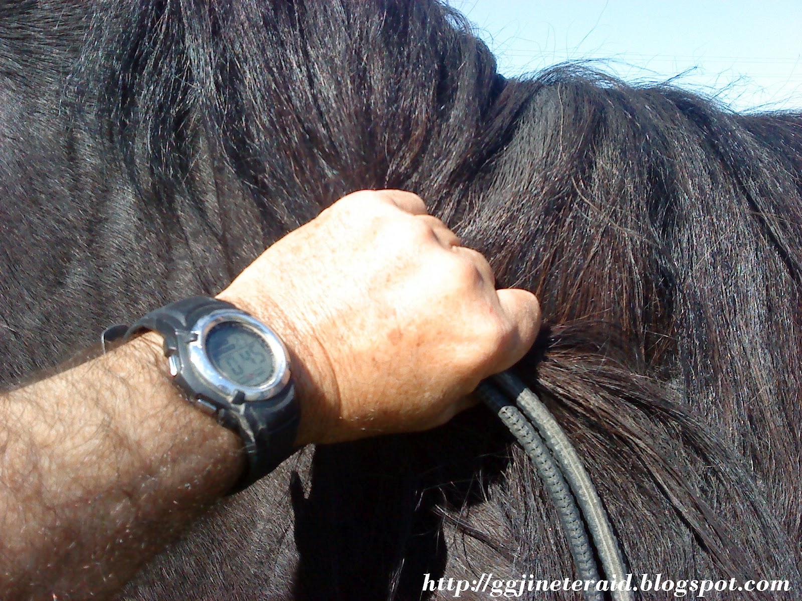 - Mi técnica de toma de Pulso en el Campo: Una vez que terminamos el entrenamiento y al tomar el pulso con el fonendoscopio ó con el pulsómetro, y para dejar quieta la cabeza del caballo y no nos moleste con el querer comer ó moverse, cogemos las riendas cortas, de manera que la cabeza quede a media altura, para que ni coma hierba ni se mueva, con las riendas cogemos un puñado de crines y así tenemos el cronometro a la altura de los ojos, para ver cuanto tarda en la recuperación.