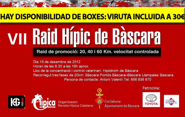El próximo día 15 de Diciembre de 2012, se correrá el VII Raid Hípico de Báscara en Girona, con las siguientes pruebas: