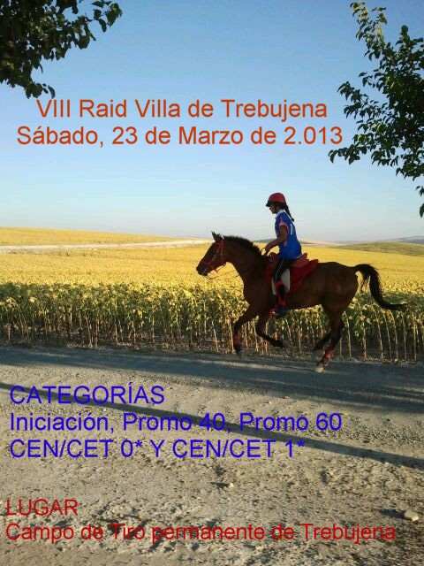 El próximo día 23 de Marzo de 2013, se correrá el VIII Raid Hípico Villa de Trebujena (Cádiz) en el Campo de Tiro Permanente de Trebujena, organizado por el C.R. E. Los Soberbios, con las siguientes pruebas: