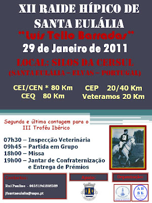 El próximo día 29 de Enero de 2011, se celebrará el XII Raid Hípico de Santa Eulalia «Luis Tello Barrada» en Santa Eulalia Elvas (Portugal).