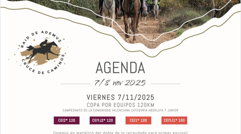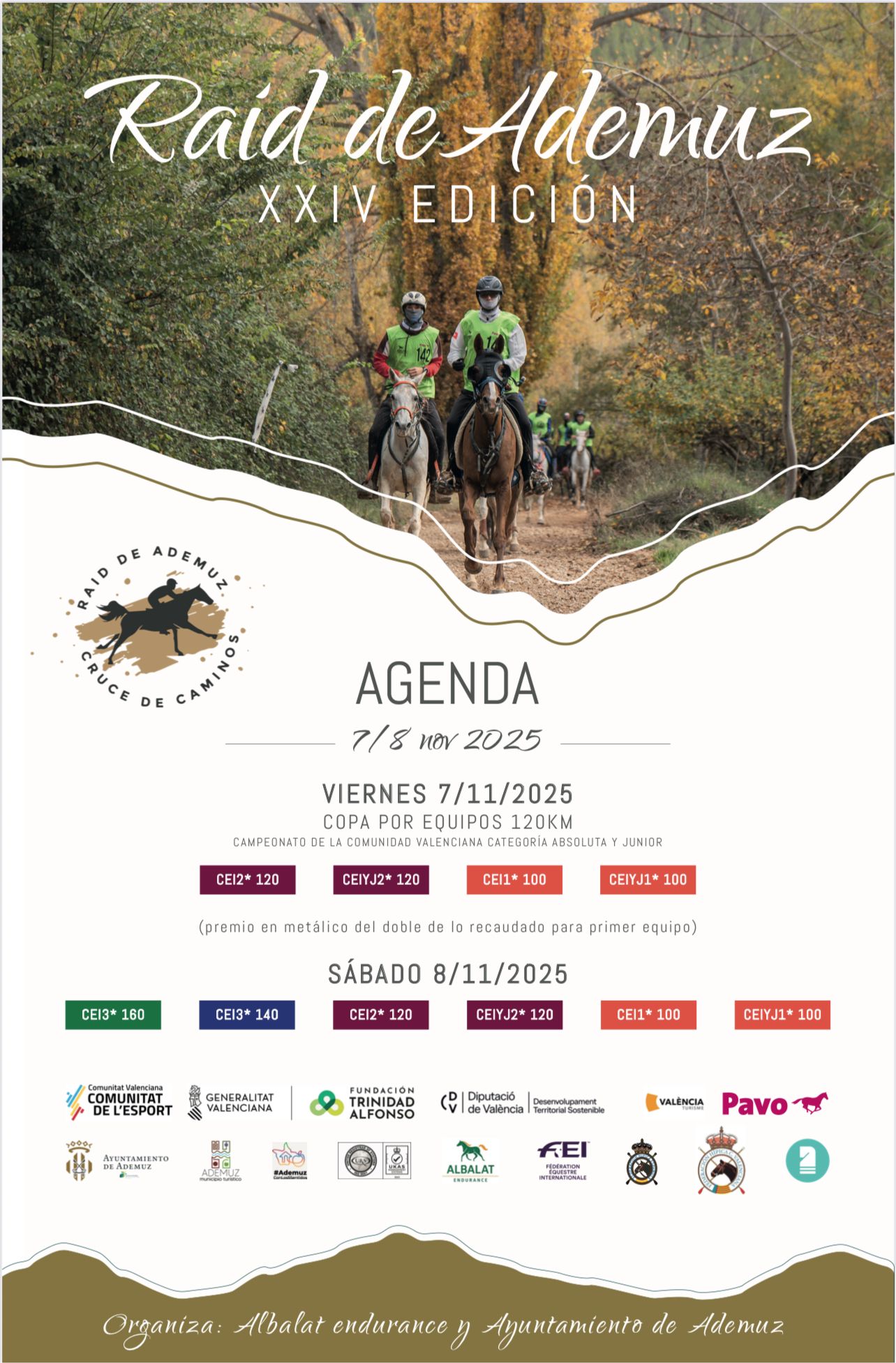 Los días 7 y 8 de Noviembre de 2025, se correrá el XXIV Raid Hípico de Ademuz, (Valencia). Copa por Equipos en el 120 Km. Campeonato de la Comunidad Valenciana Absoluto y Junior. Prueba organizada por Albalat Endurance y Ayuntamiento de Ademuz.